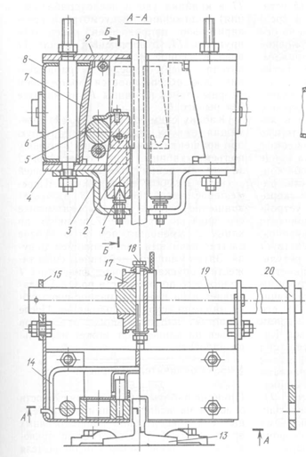 На вертикальных стенках корпуса ЛПТ при помощи пластин (позиция 15) установлена ось (позиция 19) со шкивом (позиция 16) в ее средней части. При этом шкив зафиксирован на оси проходящим через него насквозь болтом (позиция 18). Под гайкой болта и его головкой закреплены прижимные планки (позиция 17), удерживающие канатик (позиция 10) от проскальзывания вдоль поверхности шкива. Использование такого канатика позволяет обеспечить синхронное срабатывание двух ловителей, если приводным является только один. К оси приводного ловителя жестко прикреплен с помощью сварки рычаг, причем на конце этого рычага коушами удерживаются концы каната (устройства ограничения скорости), соединяющего ограничитель скорости с натяжным устройством приямка. Другой ловитель имеет на конце своей оси кулачок, воздействующий при повороте на устройство, снабженное электрическими контактами, размыкание которых приводит к обесточиванию лебедки лифта.